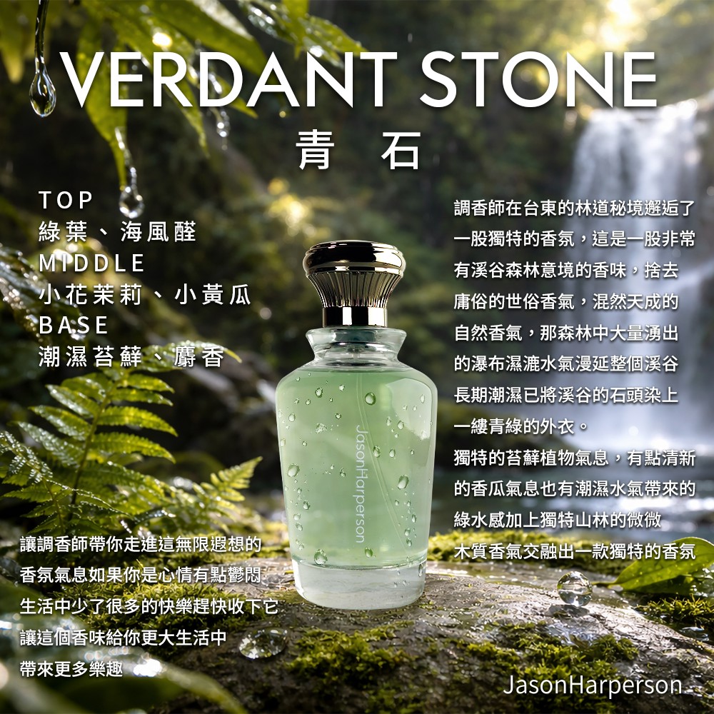 調香師在台東的林道秘境邂逅的獨特香氣,這是一股非常有溪谷森林意境的香味,捨去庸俗的世俗香氣,渾然天成的自然香氣。林中瀑布的濕漉水氣漫延整個溪谷,長期的潮濕將溪谷的石頭染上一縷青綠的外衣。獨特的苔蘚植物氣息、清新的香瓜氣息、潮濕水氣帶來的綠水感,加上獨特山林的微微木質香氣,交融出一款獨特的香氛,讓調香師帶你走進這無限遐想的香氛世界。前調:綠葉、海風醛中調:小花茉莉、小黃瓜後調:潮濕苔蘚、麝香